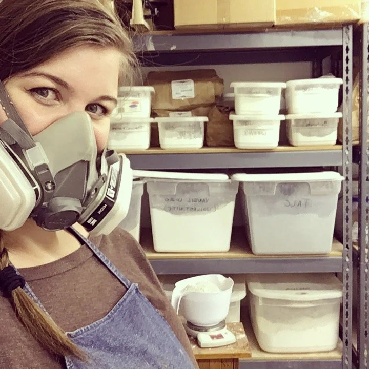 Clay and clay supplies such as glazes are all made with various powdered minerals, such as silica, copper, and manganese. While wet, these particles are typically safe to interact with; what you want to avoid is allowing them to dry and turn into dust, which then gets kicked up into the air that you breathe. Over time, excess exposure to these airborne particles could have adverse effects on your health, such as silicosis, a serious lung disease. The good news is, as long as you maintain a low dust environment in the studio, you should have nothing to worry about.