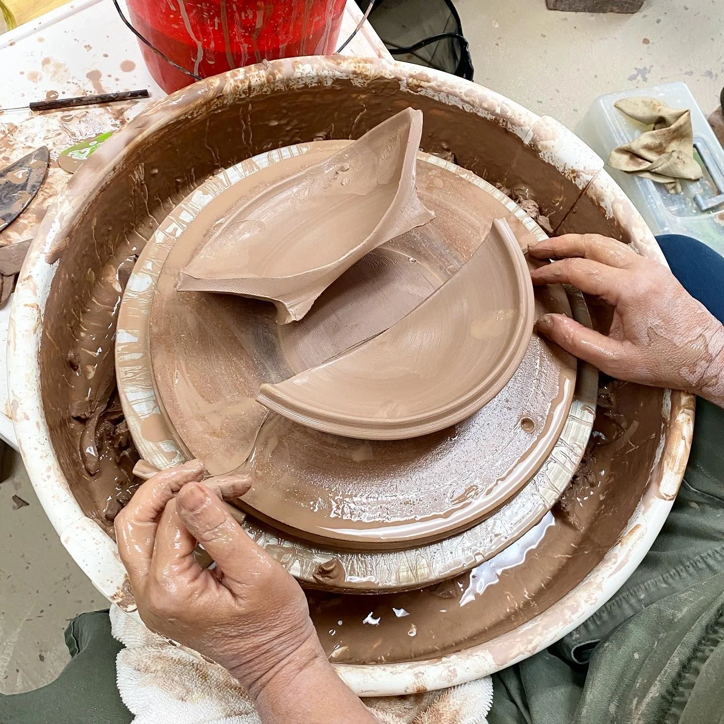 Maybe you already knew all that- but what about the idea that keeping your hands and space clean actually leads to better outcomes with your pottery? It’s true! Both wet and dry clay residue on your hands, tools, or work surfaces can transfer onto your pottery, which can cause issues all throughout your process. Think mysterious dents and sharp pokey bits, messy attachments and crawling glaze. Even just having wet, clean hands can cause big issues.